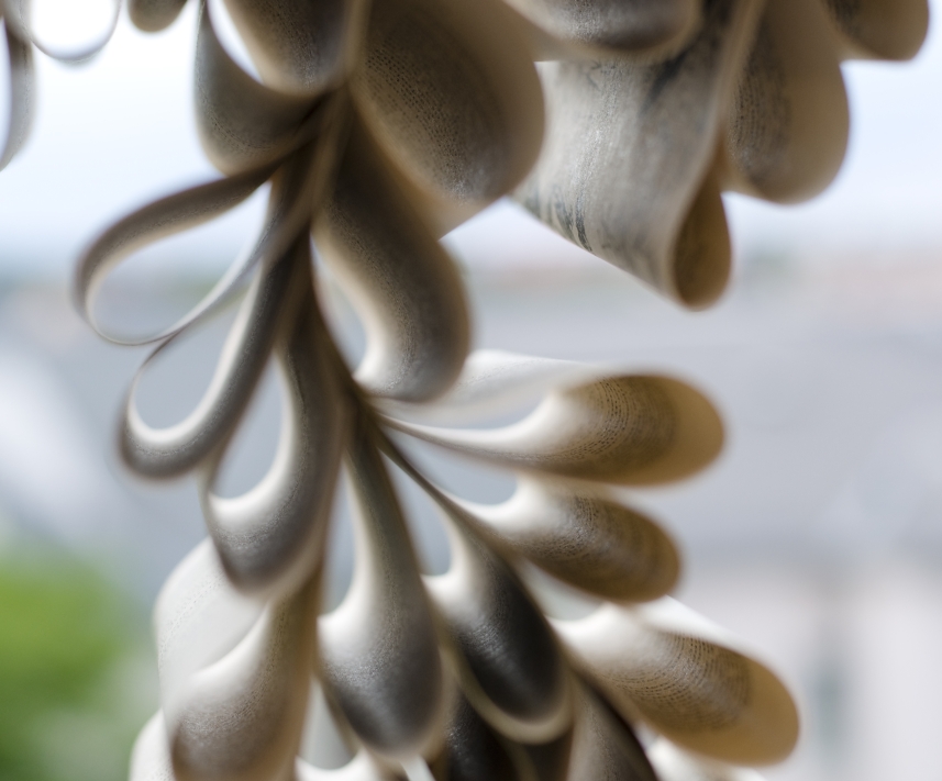 Schritt (3): Die Module habe ich nun in behutsamer Kleinarbeit zu einem Großen zusammengefügt. Bevor das Werk komplettiert wird, decke ich mit zwei Tropfenmodulen die Streichholzkonstuktion am inneren Buchrücken ab. Danach kann das große Modul mit viel Geduld und dem gezielten Einsatz von Fotoetiketten und Kontaktleim am Buchdeckel befestigt werden. Dabei sollte man berücksichtigen, dass einzelne Tropfen nun ein beträchtliches Gewicht tragen – dort lieber großzügiger mit kleinen Powerstrips-Streifen fixieren!