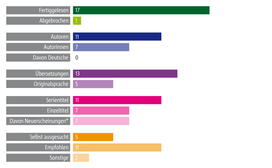 1. Ich find es gut, dass ihr englische und deutsche Bücher gemischt rezensiert. Ich meine auch, dass gerade bei den Übersetzungen immer auch ein Kommentar über die Qualität der Übersetzung vorhanden ist. Das wird dann natürlich schwierig, wenn ihr “nur” Originale lest. Gerade dieser Hinweis ist doch durchaus hilfreich.