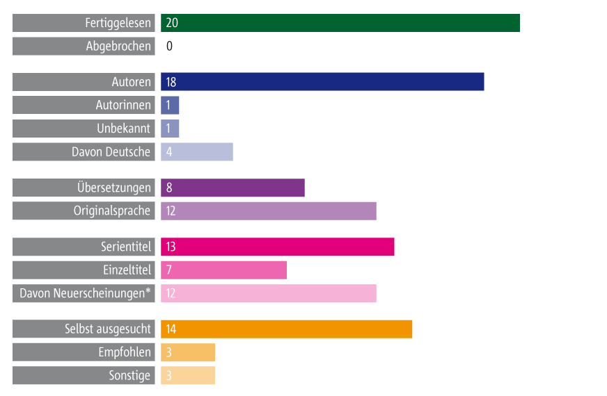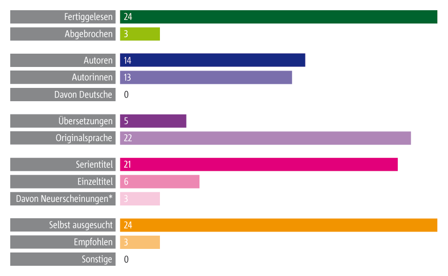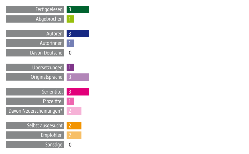Wir wollen unsere Rezensententätigkeit und unser Leseverhalten hin und wieder auch kritisch beleuchten, und dazu haben vier unserer eab-Mitglieder eine Auswertung ihrer bisherigen Lektüre 2012 vorgenommen, diesmal nicht in Form von Bestenlisten oder Tops und Flops, sondern um euch eine kleine Statistik zu präsentieren.
